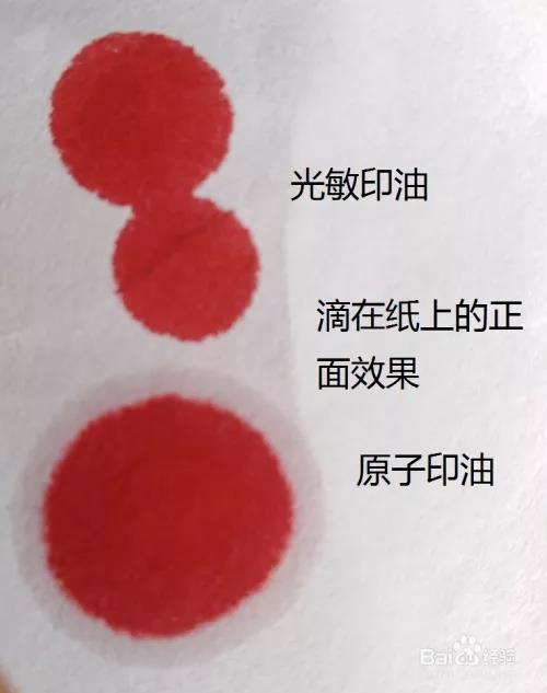 我们把光敏印油和原子油分别滴在纸上,发现光敏印油和原子印油在扩散的形状上是有很大的区别。光敏印油在纸上的只成圆形状,而原子印油渗出来的油斑外面一圈成扩散状,与本色是不同的