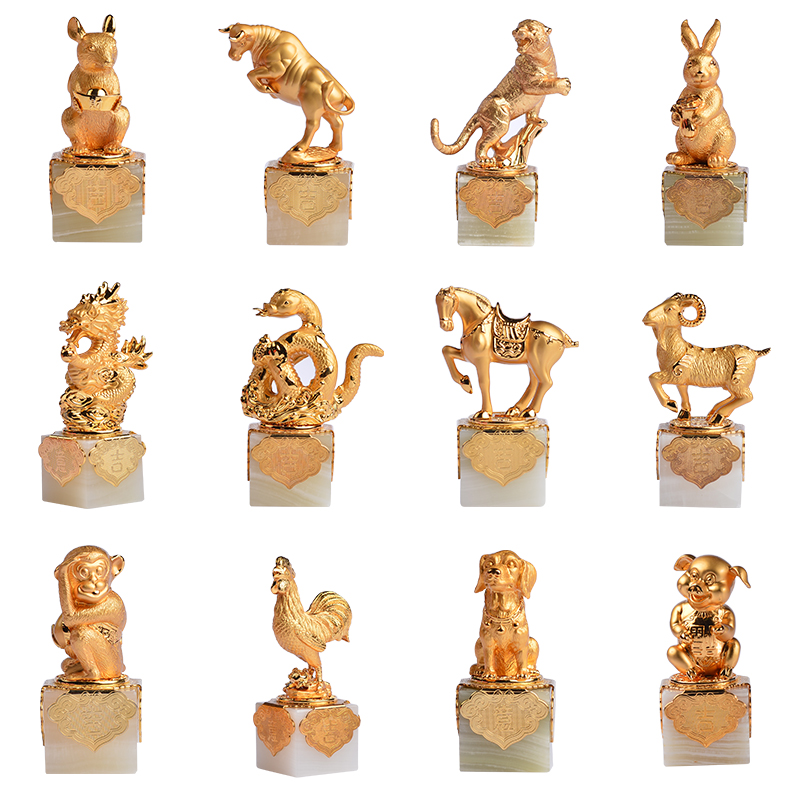 生肖作为悠久的民俗文化符号,科力印章以生肖为主题,打造出了12款带有独特民俗文化的生肖礼品印章,分别为:鼠、牛、虎、兔、龙、蛇、马、羊、猴、鸡、狗、猪。印章主体长4.4cm宽4.4cm高6.0cm,玉面长3.4cm宽3.4cm高3.1cm,其材质采用的是24K镀金,玉面采用精品岫玉。金身玉面,高贵而优雅。还等什么,科力礼品印章你值得拥有!